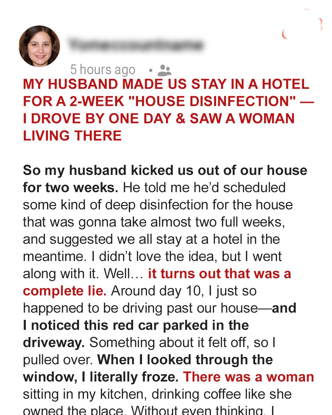 My Husband Made Us Stay In a Hotel for a 2-week ‘House Disinfection’ — I Drove by One Day & Saw a Woman Living There
