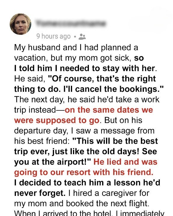 The next morning, over coffee, Ryan mentioned he’d use his time off for a “work trip”—just a few meetings nearby, to stay out of my hair while I cared for Mom.