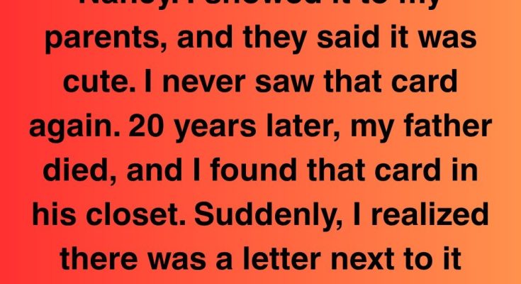 When I was 10, I got a birthday card from a woman named Nancy. I showed it to my parents, and they said it was cute. I never saw that card again.20 years later, my father died, and I found that card in his closet. Suddenly, I realized there was a letter next to it written by Dad. It said, “Mom should never know.”I opened it.The handwriting was unmistakably his—curved and careful, like he’d really taken his time. Inside, the letter started like this:“If you’re reading this, it means I’m gone, and maybe it’s time the truth comes out. Nancy is your biological mother.”