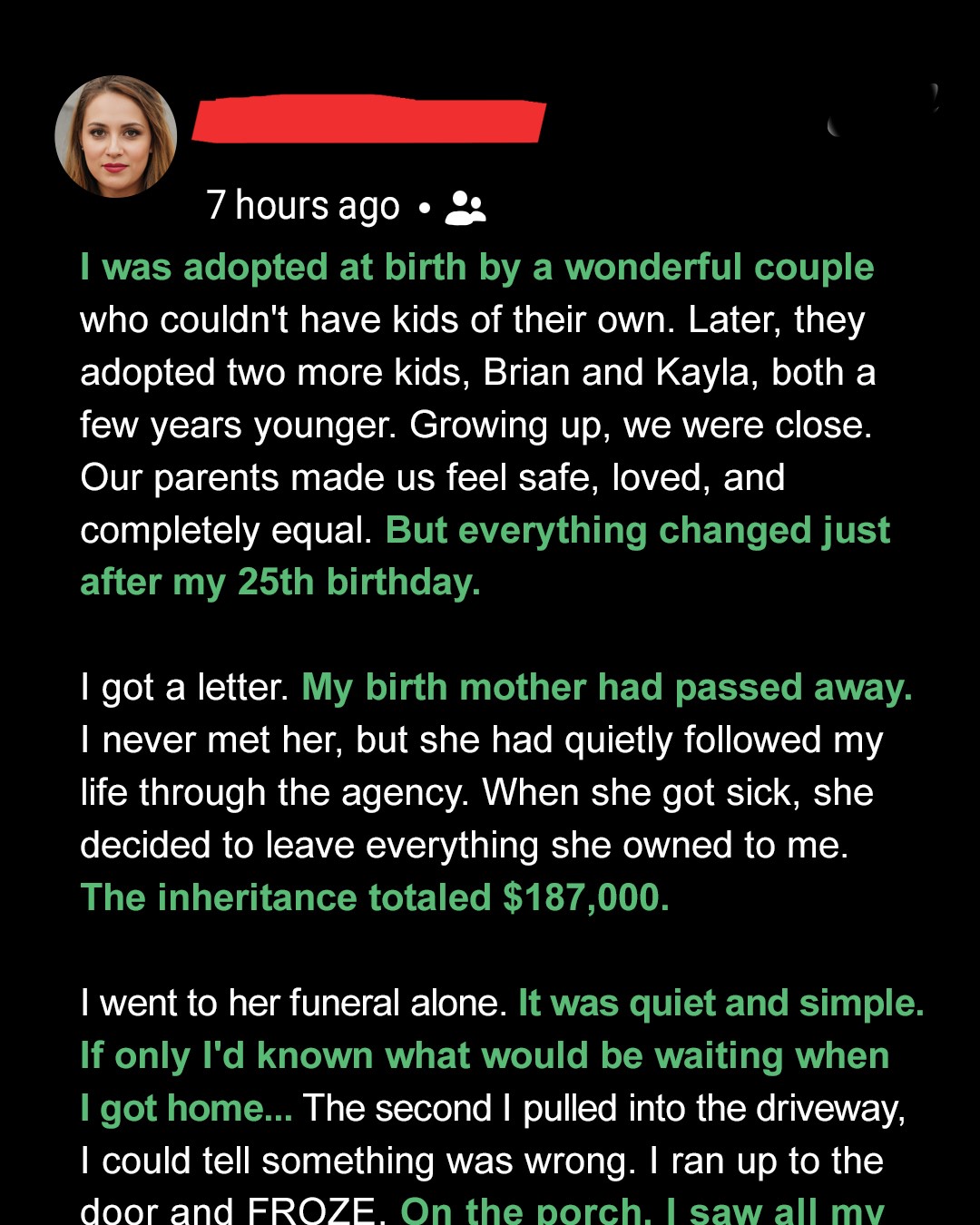 When 25-year-old Taylor inherits $187K from the birth mother she never met, she expects support from her adoptive family. But when she returns home after the funeral, she discovers a nasty surprise waiting for her.I grew up believing I was one of the lucky ones. Adopted as a baby by a couple who couldn’t have children of their own, I only knew love.