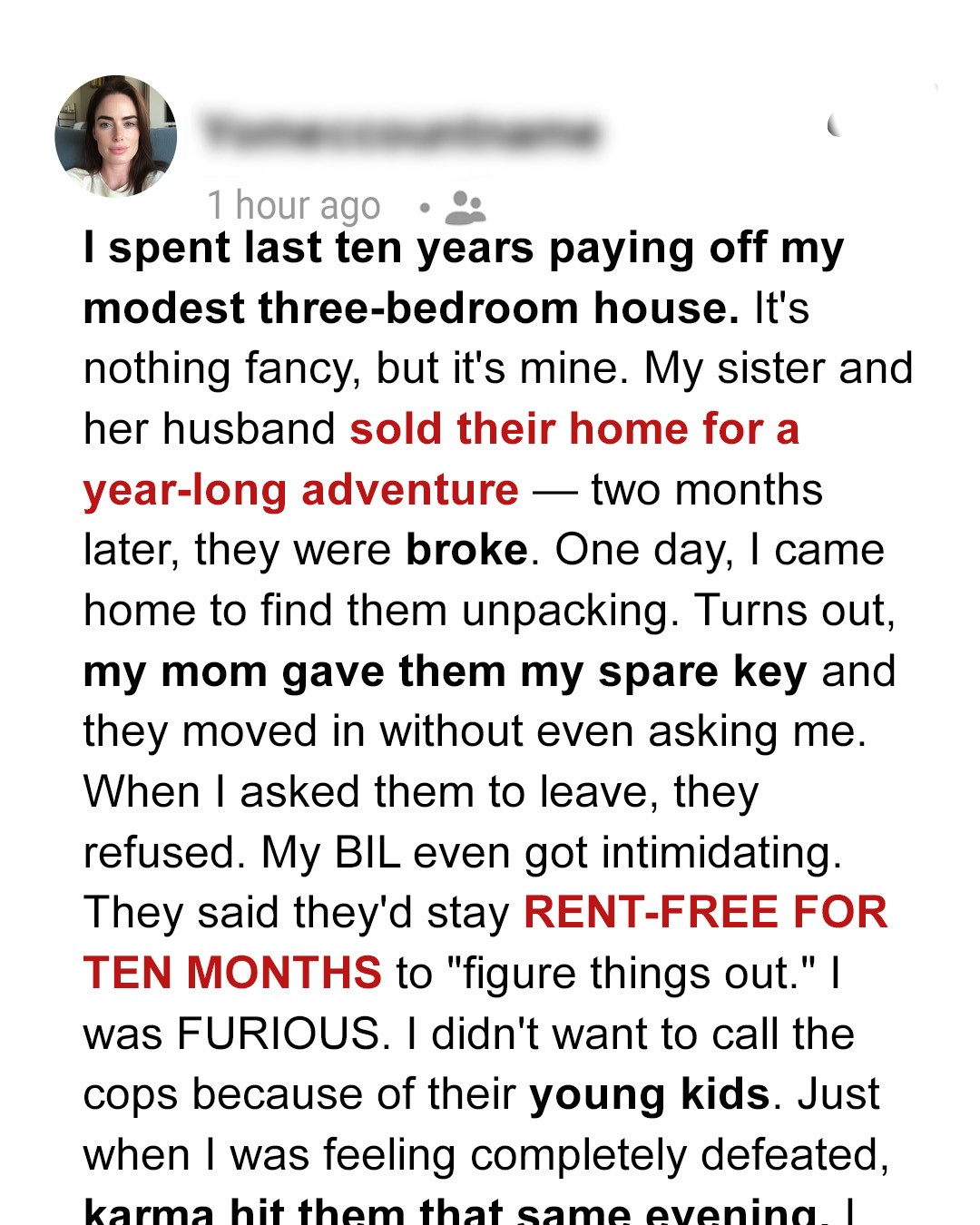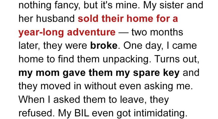 “And Mom gave us your spare key… the one you gave her for emergencies,” Holly added. “I knew you wouldn’t mind us crashing here for a bit while we figure things out. It’ll only be for a few months.”