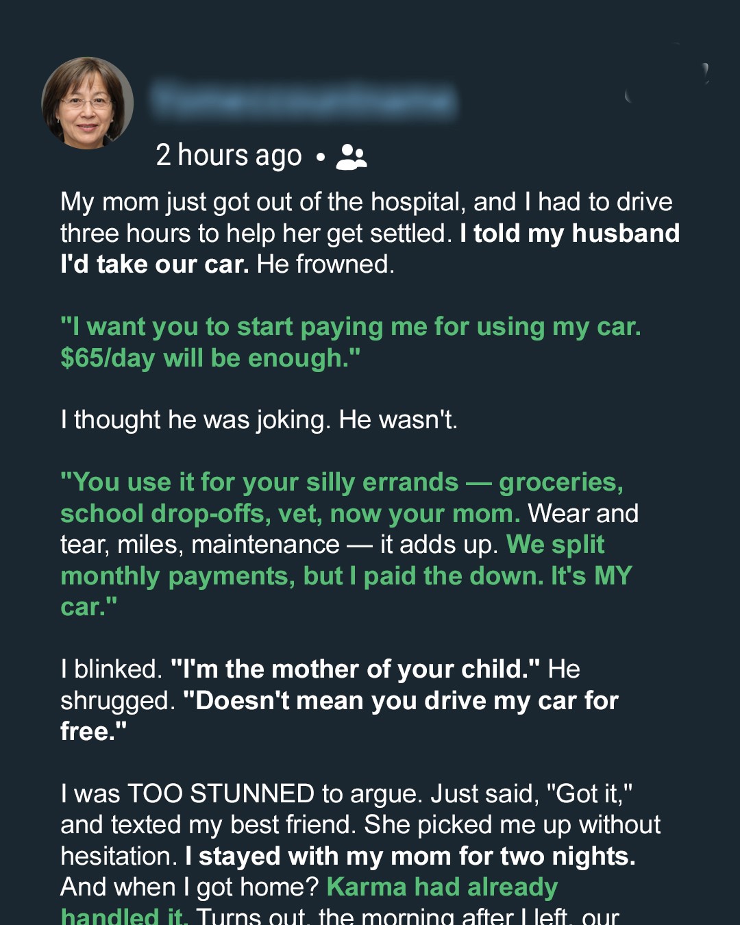 My Husband Told Me to Pay If I Wanted to Use ‘His’ Car, Like I Was Just a Roommate with a Bill