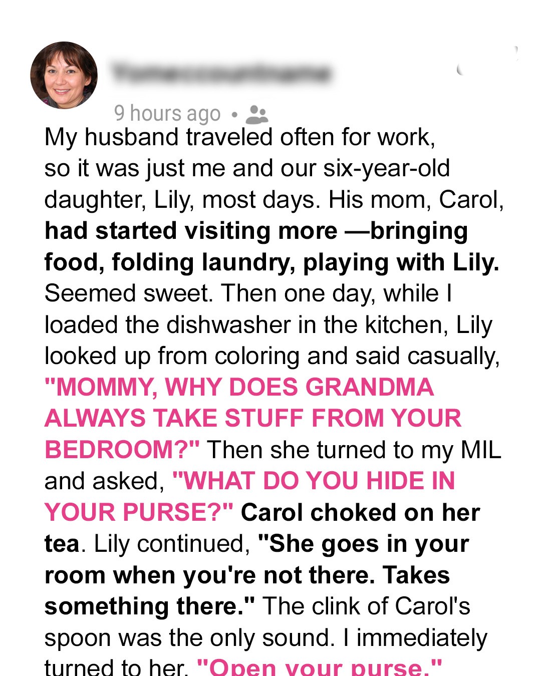 When my six-year-old asked her grandma what she was hiding in her purse, I thought it was just a silly question. But then she said Grandma had been sneaking into my bedroom. What I found inside that bag unraveled everything I thought I knew about my marriage — and my family.This year had already been heavy. James had taken that fancy promotion six months ago and had been splitting his time between cities ever since. He was gone half the week, every week.