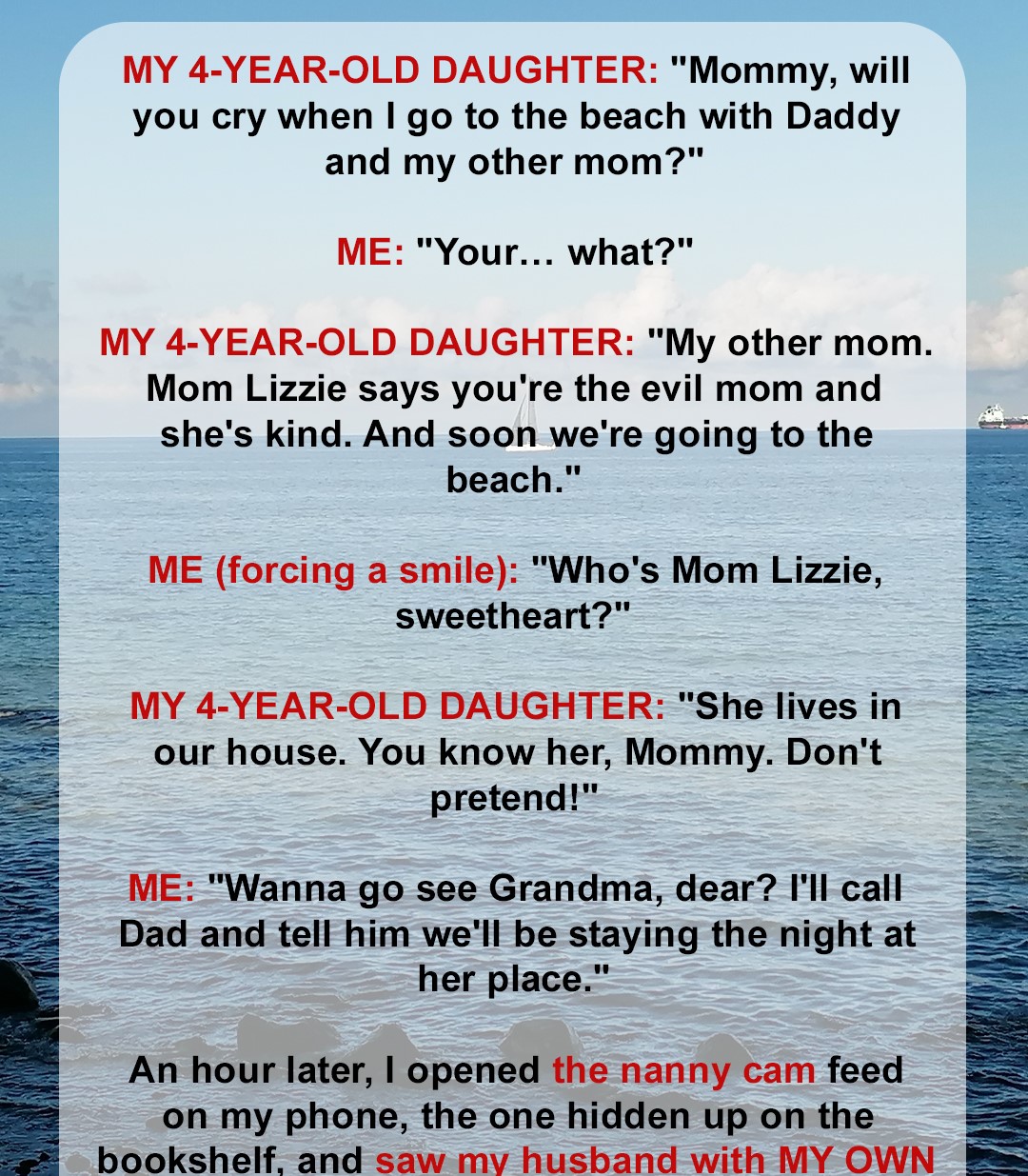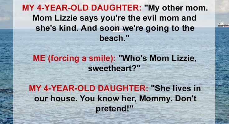 “Mom Lizzie says you’re the evil one,” she shrugged. “She’s the kind mom. And soon, we’re going to the ocean with Daddy.”