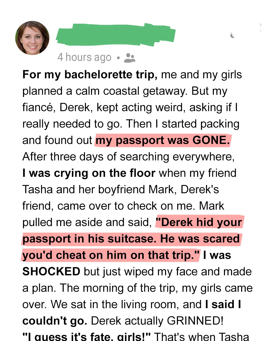 Then, in a hushed voice, he leaned in and said, “I can’t keep this from you. He has it. Derek took your passport. Hid it in his suitcase.”