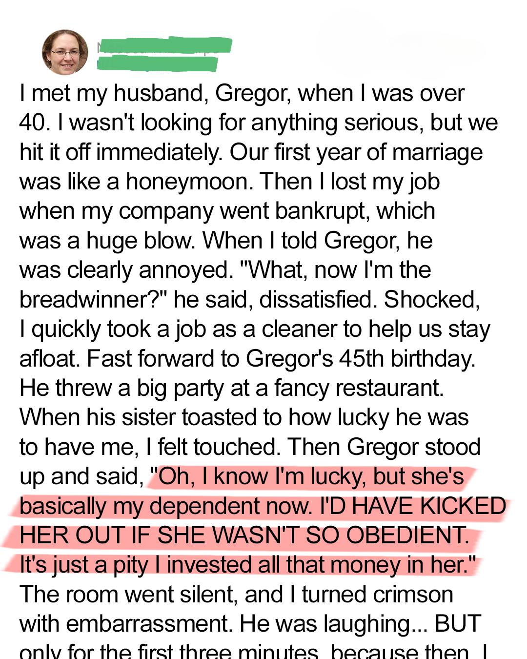 The air left my lungs. Maintenance. Like a car. Or a machine. Something necessary, but not cherished. Something that just is. He saw the flicker of pain in my eyes, and the smirk widened. “Yeah, maintenance. You keep the house running, you keep me running, you make sure everything’s tidied up. But let’s be clear,” he waved his hand dismissively, “you’re replaceable.”