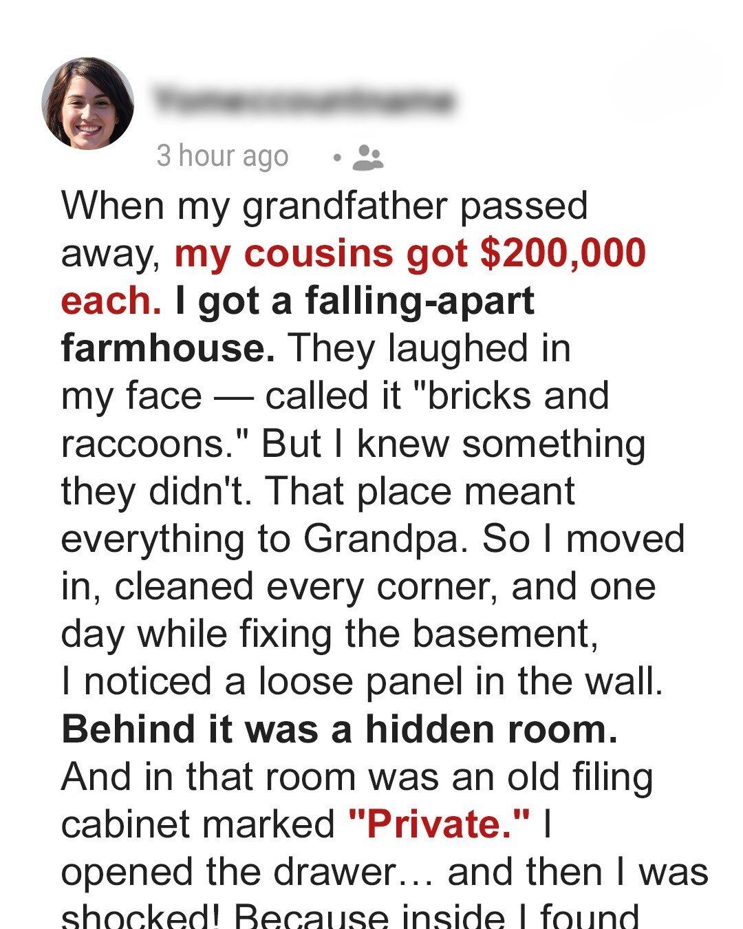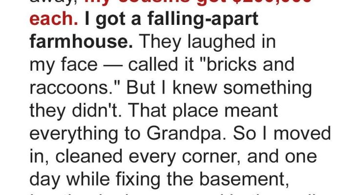 When my grandfather passed away, the entire family gathered like hungry wolves circling a feast. Everyone was eager to find out what they’d inherit. My cousins and uncles grinned as they received their checks—$200,000 each. Meanwhile, I was given what they all considered worthless: an old, crumbling farmhouse in Montgomery County. They laughed. I didn’t.To them, it was a joke. To me, it was a gift.I was the youngest grandchild, just 20 at the time. Unlike the rest of them, I actually spent time with Grandpa. I wasn’t chasing inheritance—I was building memories. Every weekend I’d visit.