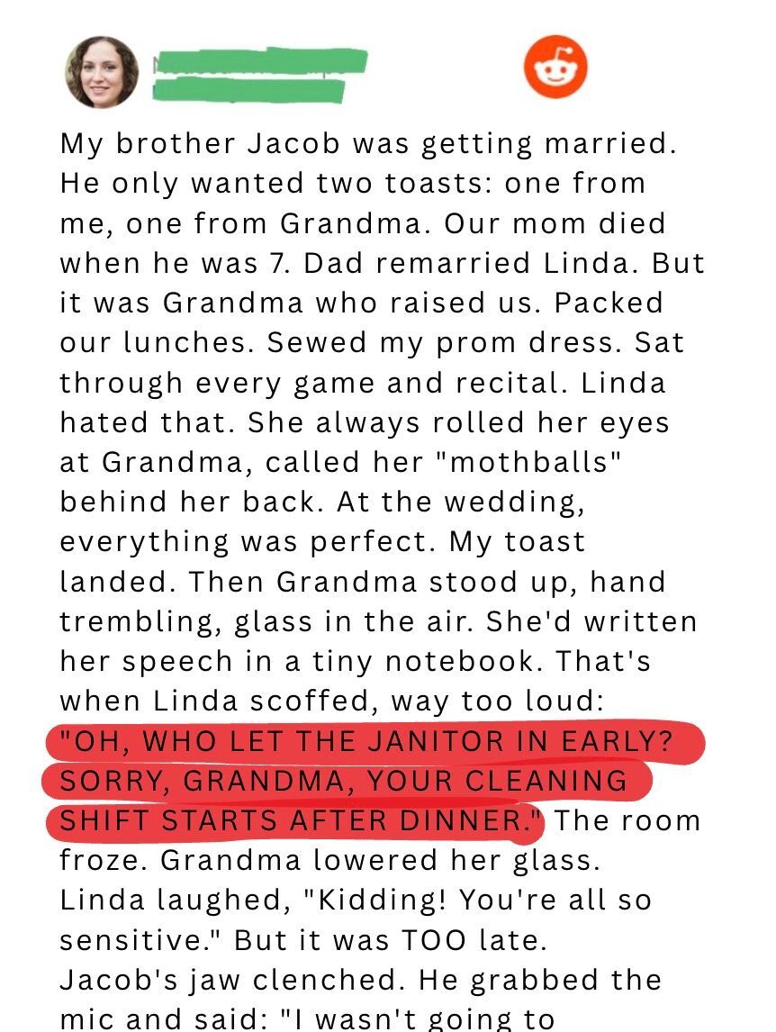 This day marked a turning point in our family dynamics. Linda’s mask had finally slipped in front of everyone. Her true nature was exposed to all the wedding guests. Dad could no longer ignore or excuse her behavior.The ceremony transformed from a celebration into a moment of justice. Grandma received the recognition she always deserved. Jacob had defended the woman who sacrificed everything for our family. The wedding became a testament to real love versus selfish cruelty.
