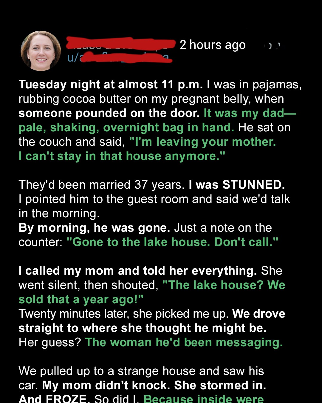 I waddled to the door as quickly as my pregnant body allowed, heart racing. Through the peephole, I saw my father’s face, oddly shadowed in the porch light.