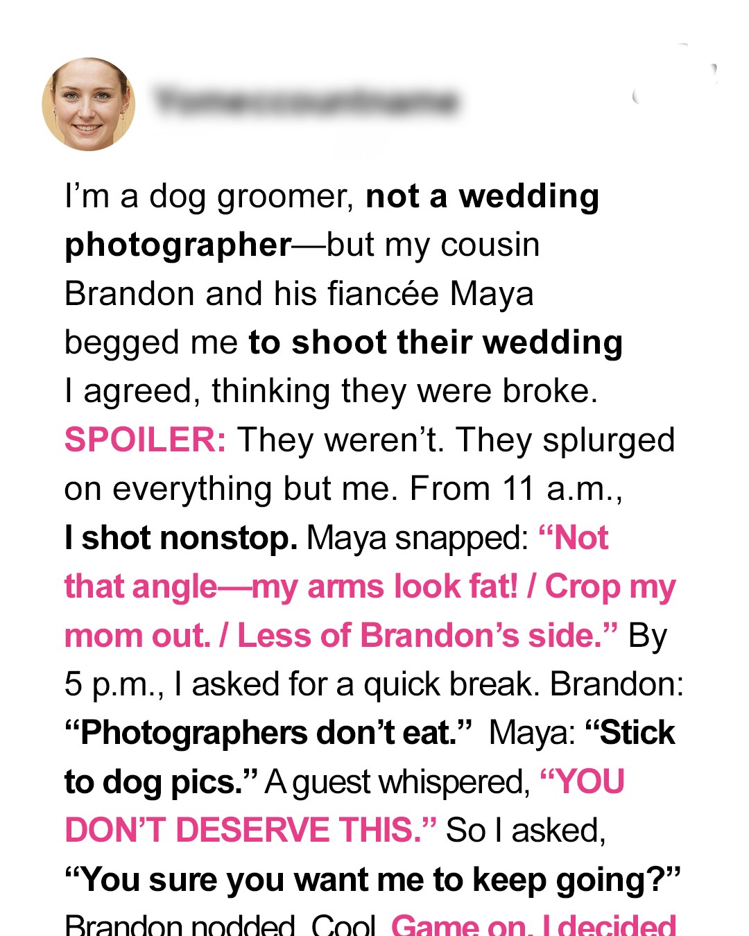 “Okay, I’ll do it. But I want to be clear. I’m a dog groomer, not a wedding photographer. I’ll do my best, but no guarantees.”