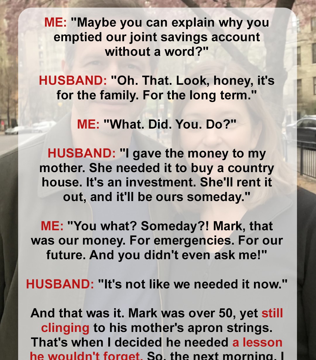 When I got a notification that nearly all our savings had been drained from our joint account, I assumed it was a hack or a mistake. It wasn’t. My husband, Mark, had done the unthinkable, and what I did next ensured he’d never forget it.There’s a saying that you can tell a lot about a man by the way he treats his mother.In Mark’s case, I learned that sometimes, a man can treat his mother too well. For years, I let it slide, but this time, he crossed a line so bold it couldn’t be ignored.