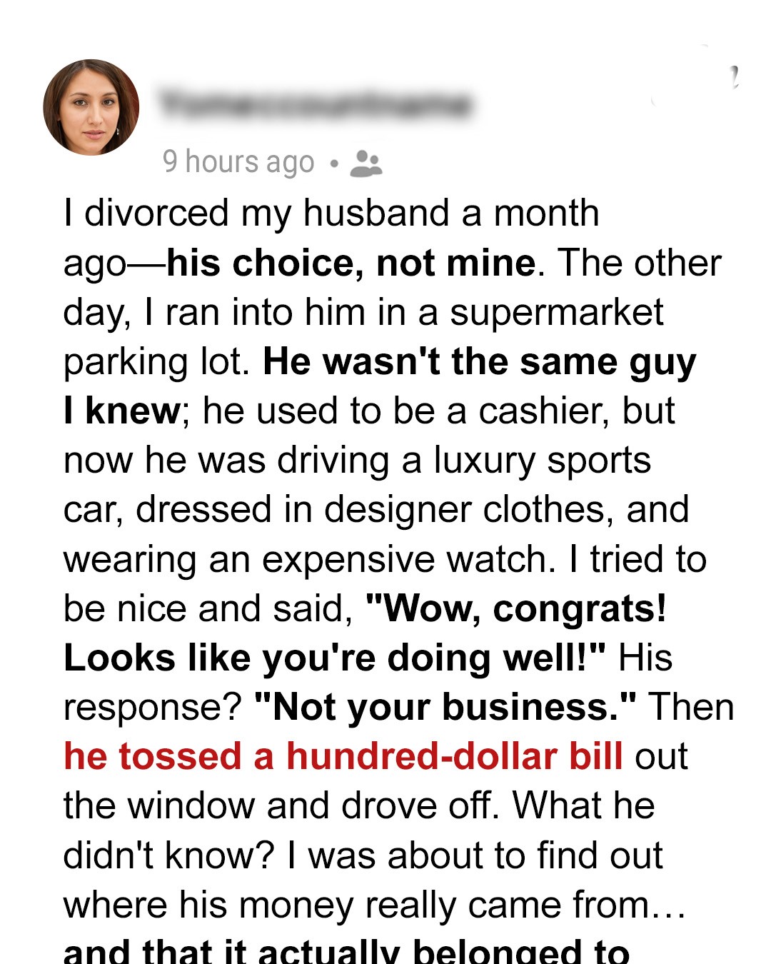 “No, it’s nothing like that,” I began and reached into my pocket for the $100 bill. “I’m asking because I just saw Michael, my ex, driving a sports car and wearing clothes worth more than our old rent. He threw this at me. I drew that smiley face on the stack of cash Grandpa offered me.”