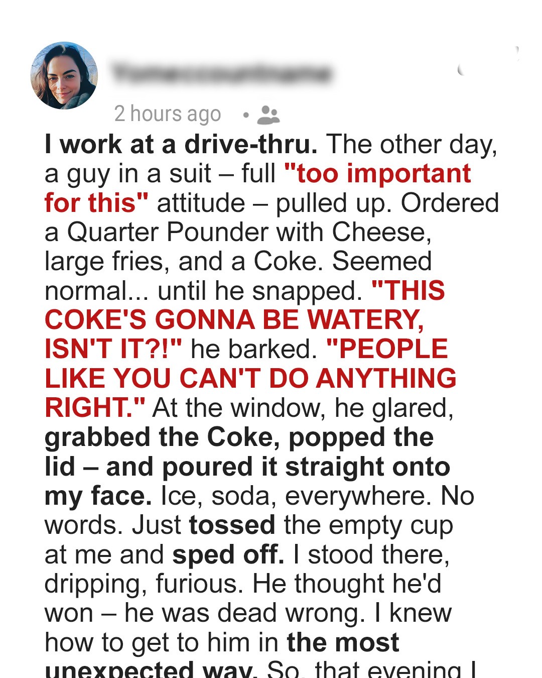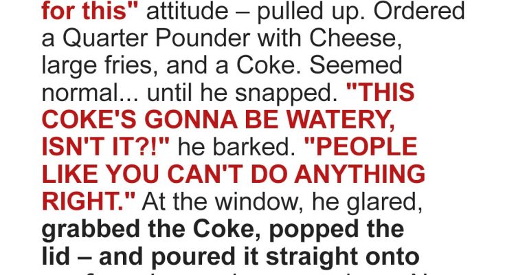 An entitled customer rolled up to the drive-through and ordered food like he owned the place. Then he humiliated me in front of my coworkers and poured Coke in my face before fleeing in his fancy car. What happened next was unforgettable… because I made sure he regretted every second.They say you don’t know how strong you are until strength is all you’ve got left. I didn’t ask for life to be hard — I just wanted to raise my boy right. My name’s Janice. I’m 36, a single mom working sunrise to past sundown flipping burgers, calling out orders, and wearing a smile that ain’t always real. I don’t get to break down. I can’t afford it. The only thing I get is to… keep going.