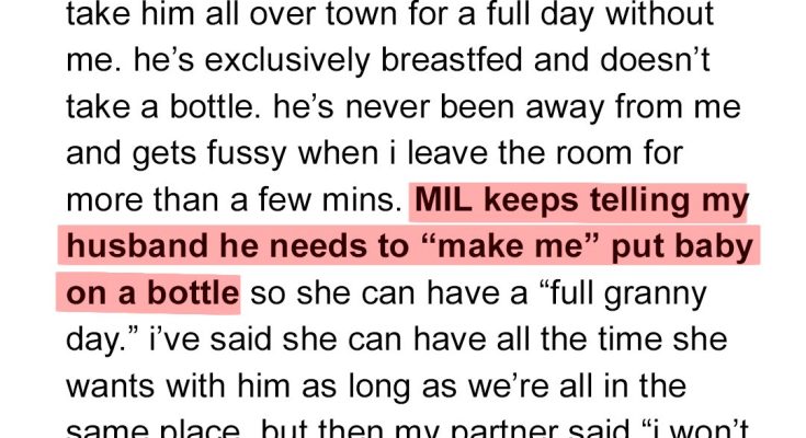 “You need to start training him, honey. Put him on formula. Mom says you’re being selfish, keeping him from his family.”