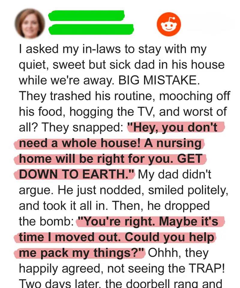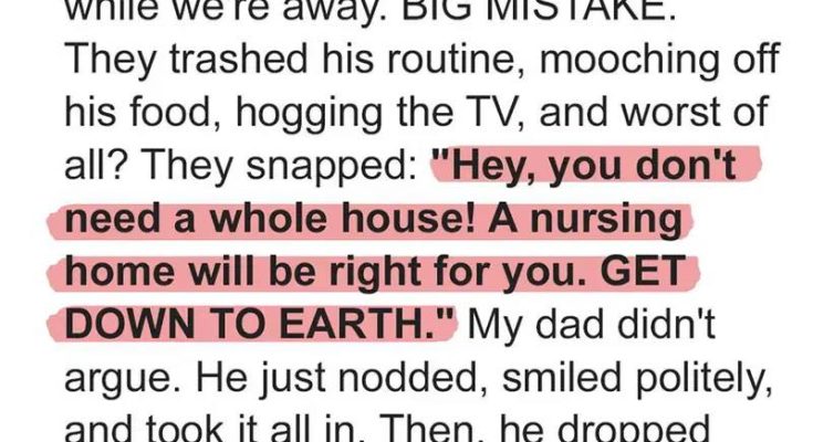 My dad’s house wasn’t just bricks and mortar; it was my childhood. Every creak, every worn spot, whispered stories only I could hear. It was home, not just for him, but for a piece of my soul. My dad, a quiet man of immense dignity, lived there alone after my mom passed. He was perfectly content, or so I thought.Then came my in-laws. They were… different. Everything was about status, about acquisition. They’d visit, and their eyes wouldn’t just scan the decor; they’d appraise the property. My dad’s sprawling, old-fashioned home sat on a prime lot in a gentrifying neighborhood. Their whispers started subtly.