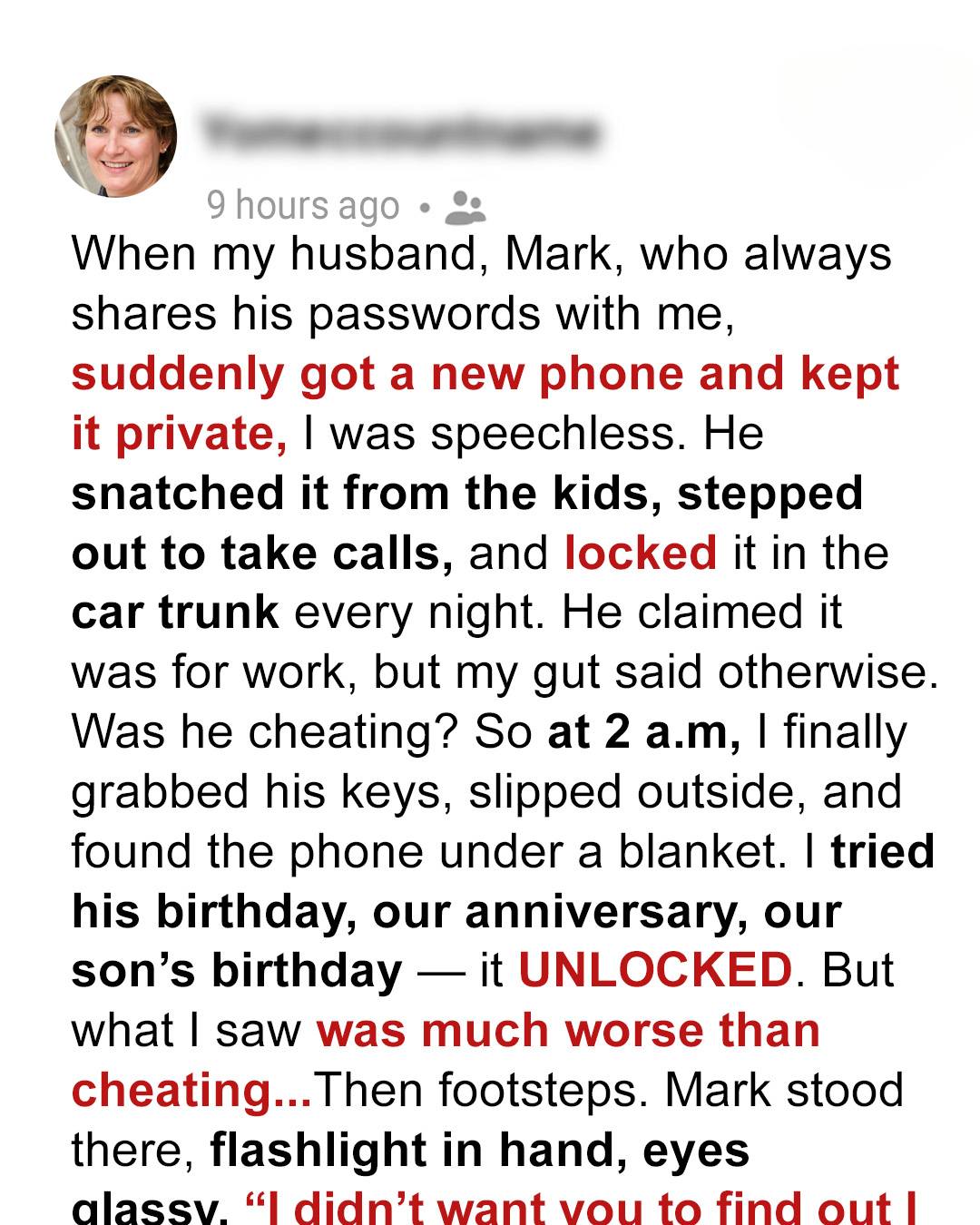 The phone slipped from my grasp, clattering to the floor. The screen, still lit, reflected my own face – pale, tear-streaked, utterly shattered. I hadn’t been betrayed by a lover; I had been blindsided by a tragedy, hidden by the man who loved me enough to endure it alone. My chest felt hollowed out, aching with a pain far greater than any betrayal. It wasn’t just my husband’s secret that changed everything. It was the crushing, silent truth about our child, and the agonizing realization that I was so consumed by my own fears, I missed the magnitude of his silent suffering. My world didn’t just change; it imploded.