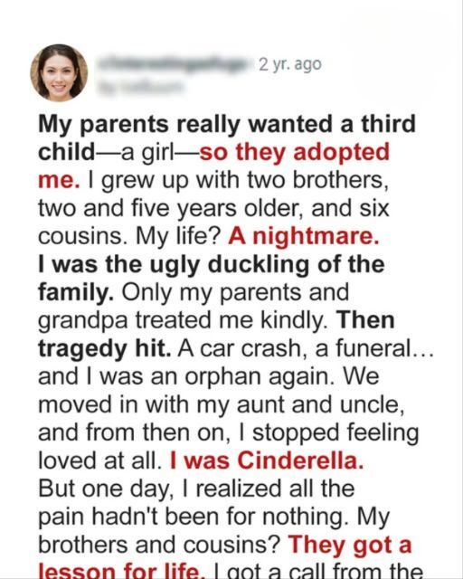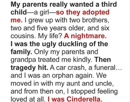 My parents really wanted a third child—a girl—so they adopted me. I grew up with two brothers, two and five years older, and six cousins. My life? A nightmare. I was the ugly duckling of the family. Only my parents and grandpa treated me kindly. Then tragedy hit. A car crash, a funeral… and I was an orphan again. We moved in with my aunt and uncle, and from then on, I stopped feeling loved at all. I was Cinderella. But one day, I realized all the pain hadn’t been for nothing.
