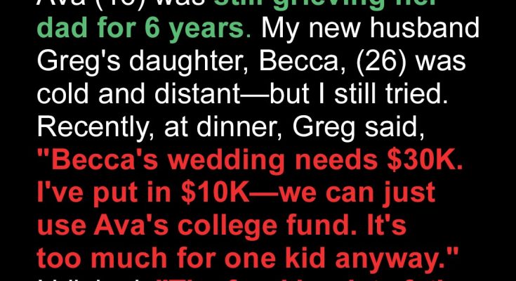 When Greg suggested we dip into Ava’s college fund — money left by her late father — to pay for his adult daughter’s wedding, I was stunned. His smug entitlement and his daughter’s silent expectations left me reeling. I nodded politely… but I had a different plan brewing.Six years ago, I remarried, stepping into what I knew would be a delicate balancing act.