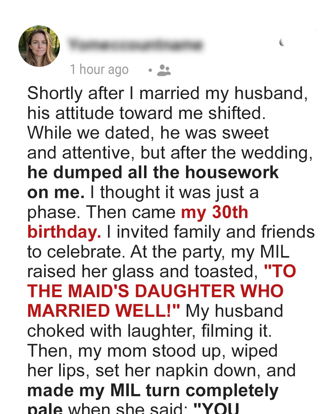 I contacted a lawyer — my mother covered every bill. I pointed out how his neglect at home had gone unnoticed by many, but was ultimately evidence of his lack of partnership. That video of his mother’s toast was proof of his mocking behavior at my expense.