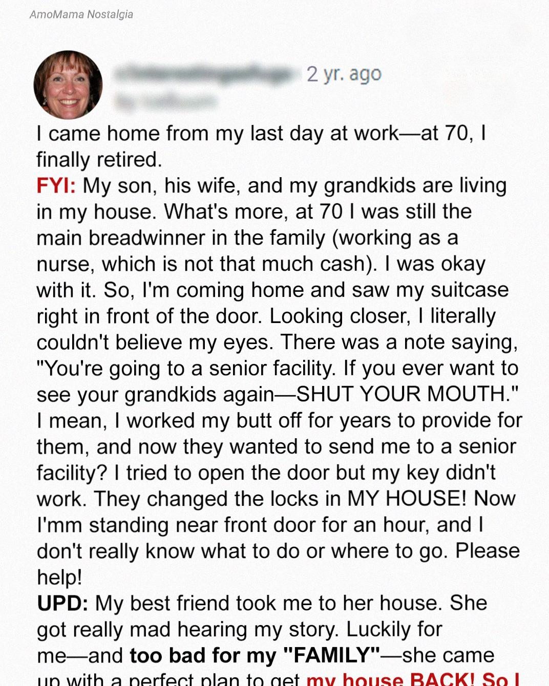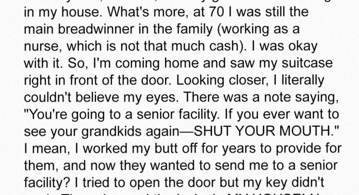 My legs gave out. I sank onto the armchair I’d bought with my first big bonus, the one I’d always called ‘mine.’ Now it felt alien. “WHY?” The word tore from my throat, raw and desperate. “After everything? After 45 years? After 70 years of life, 45 with you, 25 raising them? On my retirement day?” No answer. Just a slow, deliberate nod towards the door where two suitcases stood, neatly stacked, a duffel bag beside them. My world was crumbling. The sanctuary I’d built was a cage, and I was being cast out.