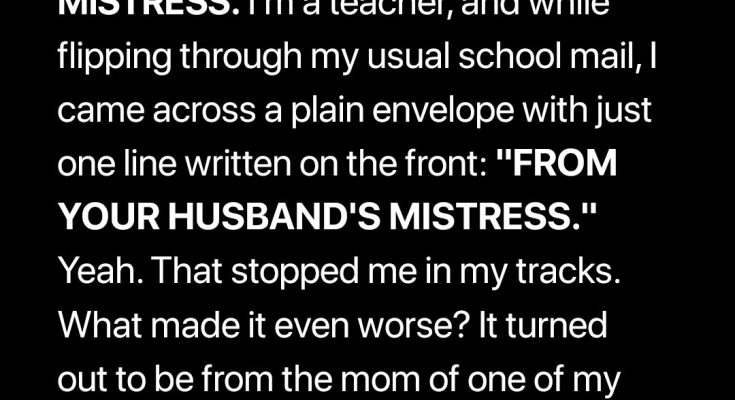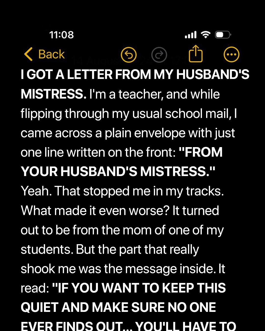 “You don’t know me personally, but I know plenty about you. I’ve been seeing your husband, Mark, for the past eight months. I’m writing because I believe you deserve to know the truth.”