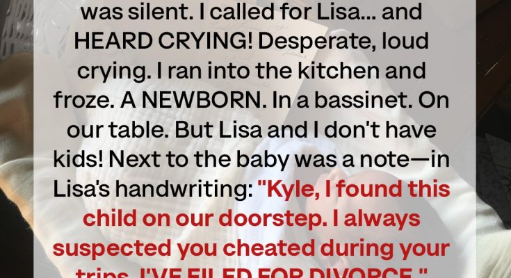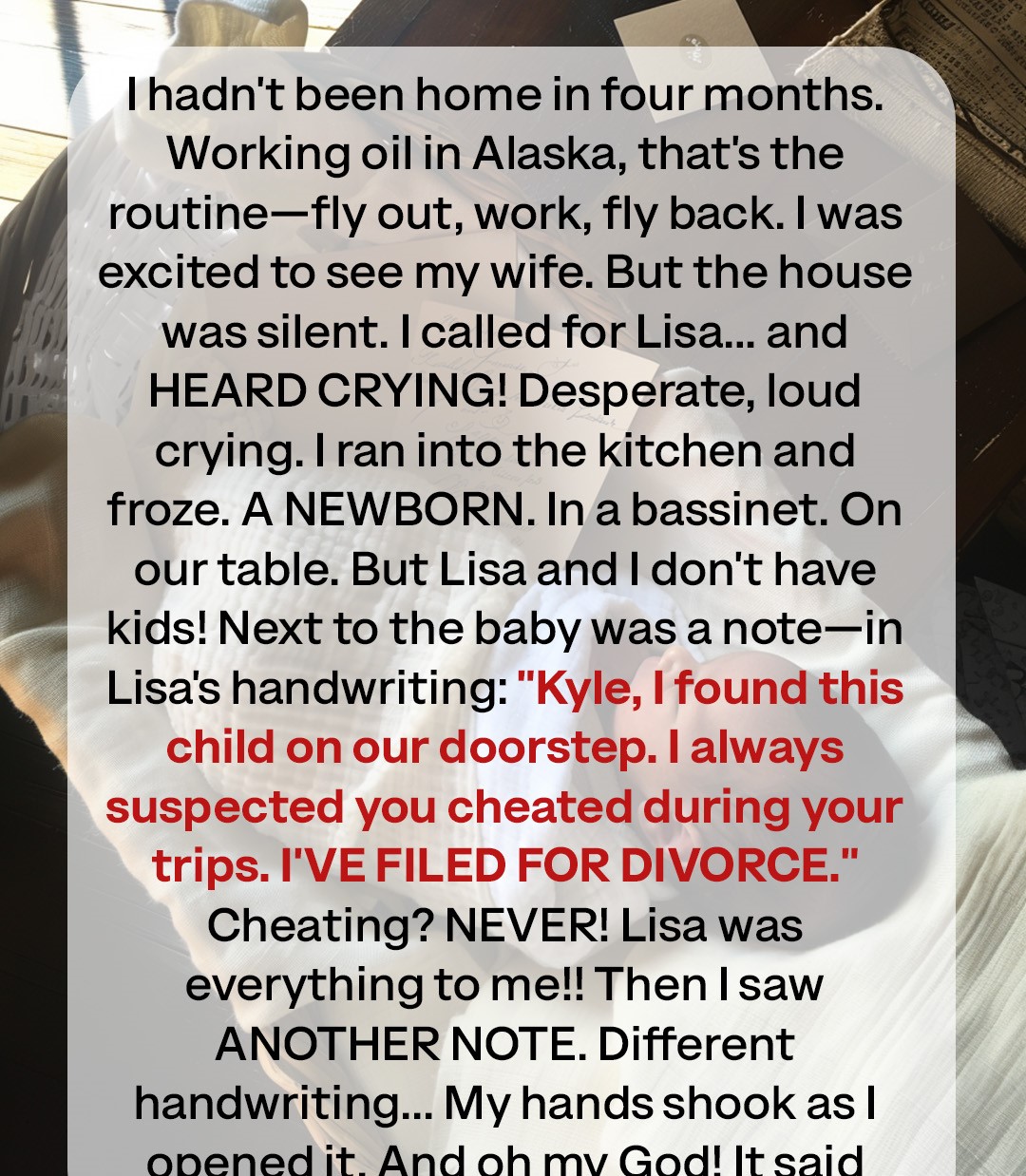 “Kyle, yesterday I found this child on our doorstep with that note attached. I always suspected you cheated on me during your business trips, but I didn’t hold a grudge on you for that — after all, I had plenty of flings while you were away — but saddling me with someone else’s byblow is too much. I’ve filed for a divorce, and I earnestly hope I will never see you again.