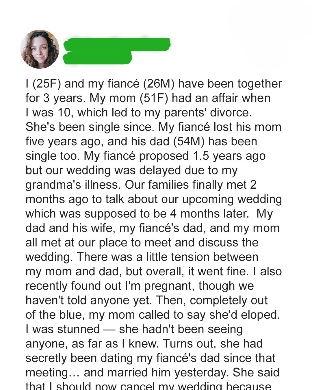 A pregnant woman staring thoughtfully out a window | Source: PexelsJust weeks before my wedding, my mother called with news: she’d secretly eloped — with my fiancé’s dad! Then she demanded I cancel my wedding because it would be “inappropriate.” She thought I’d back down. Instead, I struck back.I was 25, deeply in love, and finally standing on the threshold of the life I’d dreamed about since I was a little girl.My parents divorced when I was ten, after Dad found out Mom had an affair. I grew up bouncing between relaxing weekends with Dad and weekdays filled with Mom’s unpredictable drama.