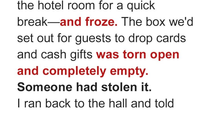 “The wedding gifts, Josh!” I said. “Someone took the money and the cards! It’s… just gone.”