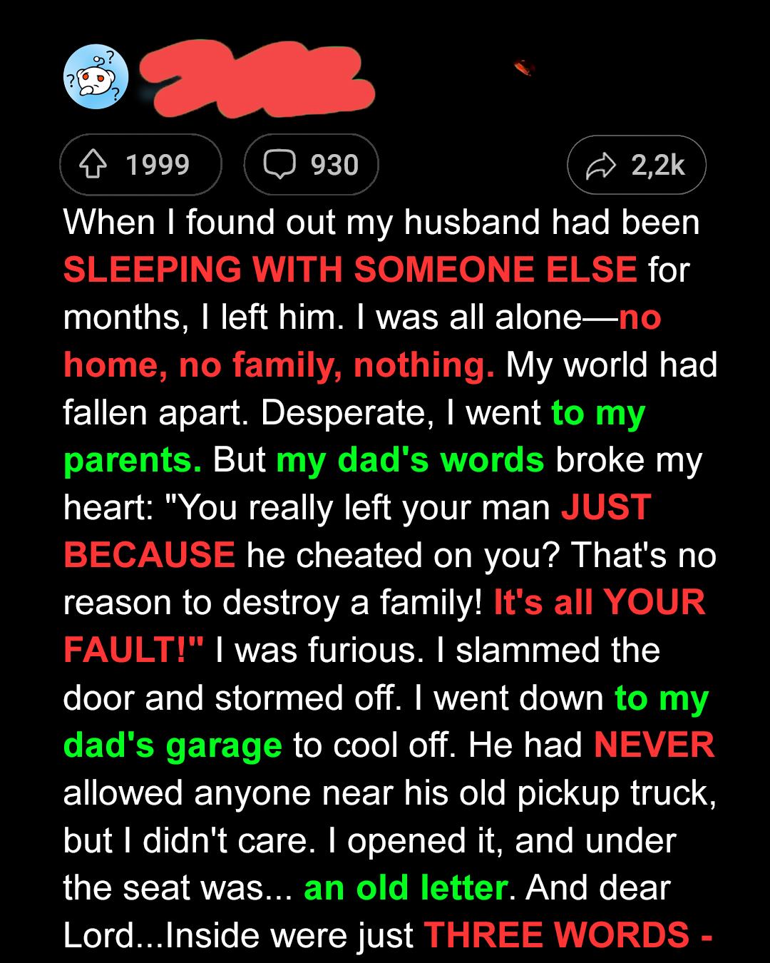 I came home heartbroken, ready for comfort. Instead, my father gave me judgment. My husband had cheated, and when I told Dad, he dismissed it: “That’s no reason to throw everything away.” Angry, I escaped to the garage. That’s when I noticed Dad’s old red pickup—the one he never let anyone touch. The back hatch was unlocked.Under a hidden panel, I found a yellowed envelope. On the front, in careful handwriting, were six words: “Please Come Back.” The letter held an address two towns over.