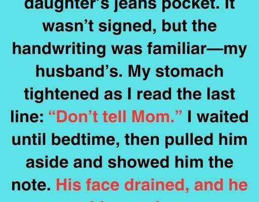 While doing laundry, I noticed a crumpled note in my daughter’s jeans pocket. Though not signed, it was written in my husband’s hand. Read the last line: “Don’t tell Mom.” My gut constricted. After bedtime, I showed him the note. His face drained, he muttered, “It’s not what you think.”No breath for a moment. My fingers gripped the paper. “Then explain it,” I whispered to avoid the kids. He massaged his eyes to buy time, but I could tell his mind was already racing.
