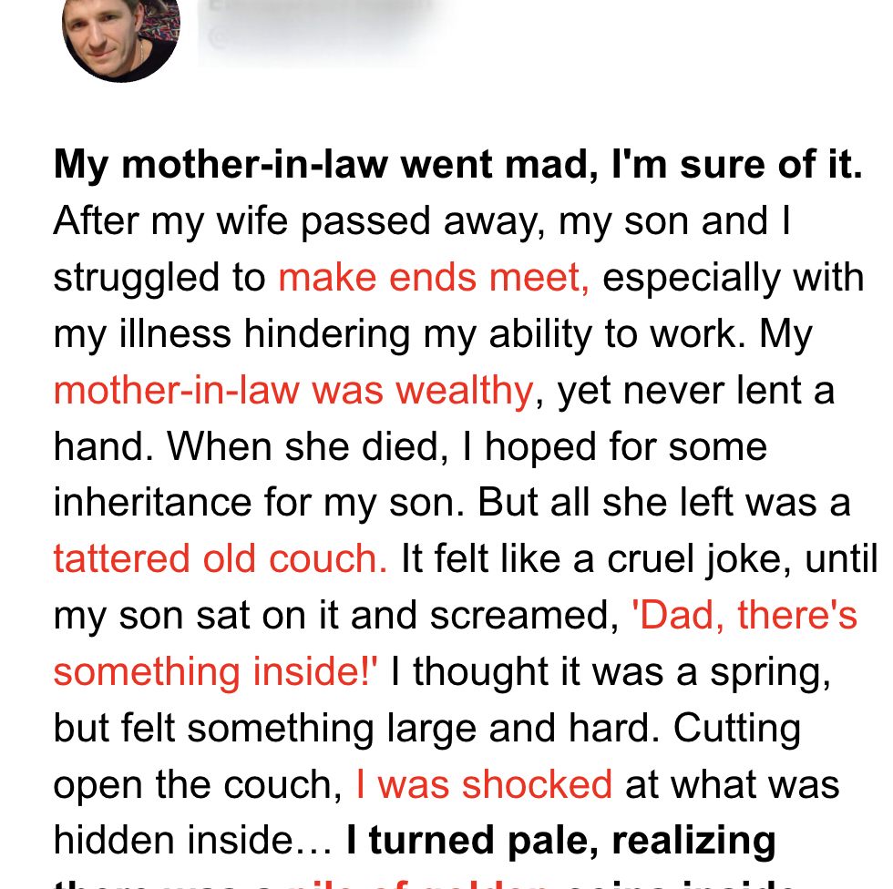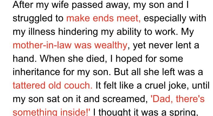 Dad grabbed a drink from the fridge and sank into his armchair, watching TV on full blast. Kevin knew Dad wasn’t affectionate like Mom, but it still hurt him.It was too much to bear—everything Kevin had been through—first losing Mom six months ago, and now Granny.Kevin sighed as he sat on Granny’s sofa.Suddenly, he felt something—a pointy edge poking him in the back.He prodded the seat with his hand and gasped. “There’s something inside!” he cried, but Dad was too engrossed in whatever he was watching to hear him.