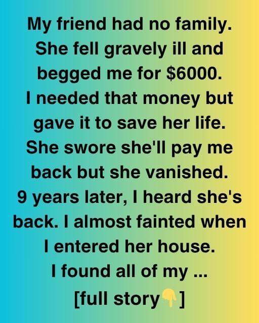 I stood dumbfounded. I spent years thinking she stole my money and destroyed our friendship. However, the truth was darker and sadder than I expected. I felt guilty for criticizing her for years. We cried until we couldn’t, sitting next to her and holding her chilly hand.She promised to pay, but I chuckled through tears. I informed her, “You don’t owe me a penny.” “You owe me your life, and you paid in full by living.”