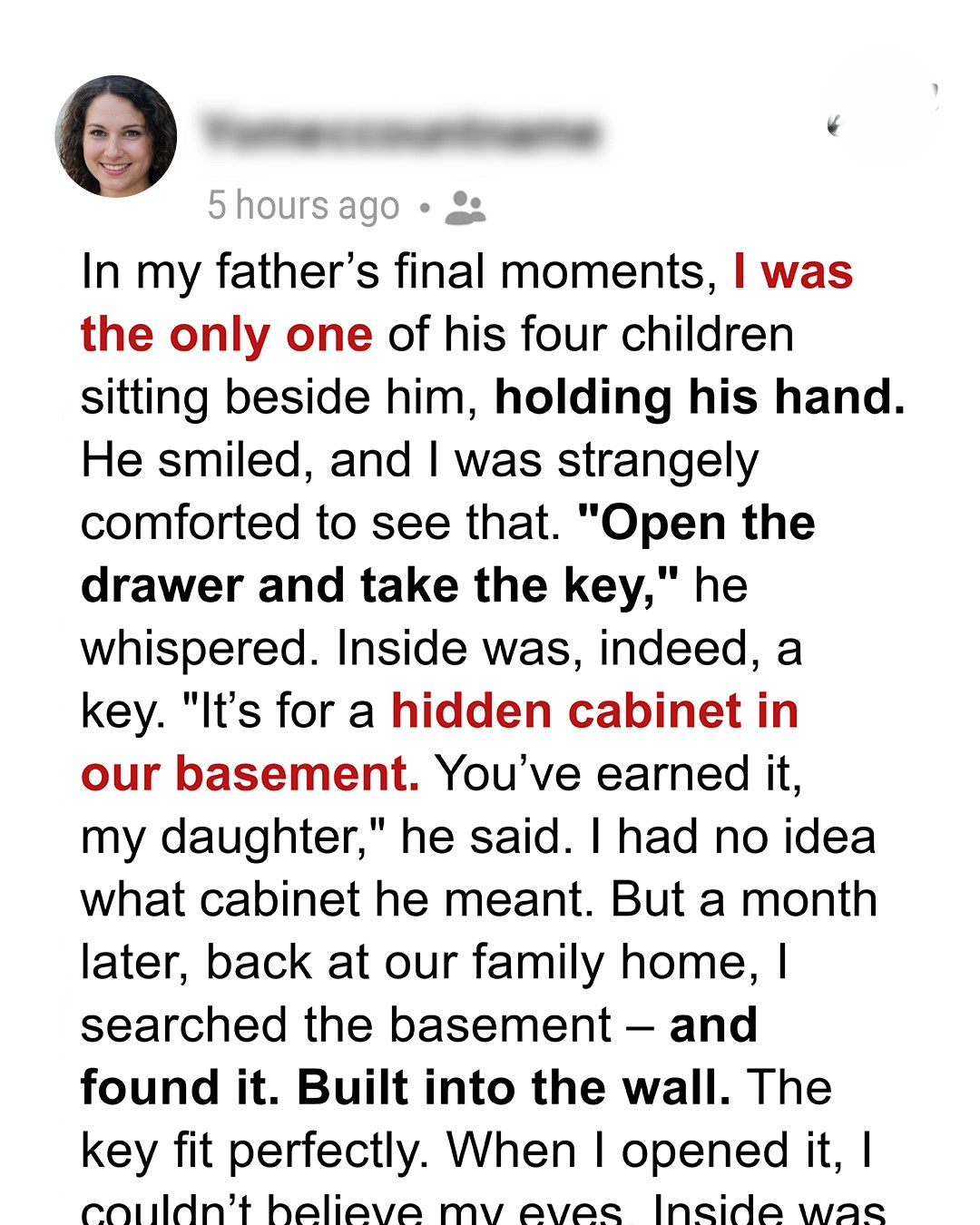 Growing up, my older siblings always accused me of being our dad’s favorite, so they always outcast and bullied me. But when Dad died, I was by his side, and he thanked me by gifting me a key that opened something my siblings would kill for. Something life-changing.In my father’s final moments, I was the only one of his four children sitting beside him, holding his hand. Little did I know that my love and loyalty would land me in his good graces, receiving a massive gift I never imagined.