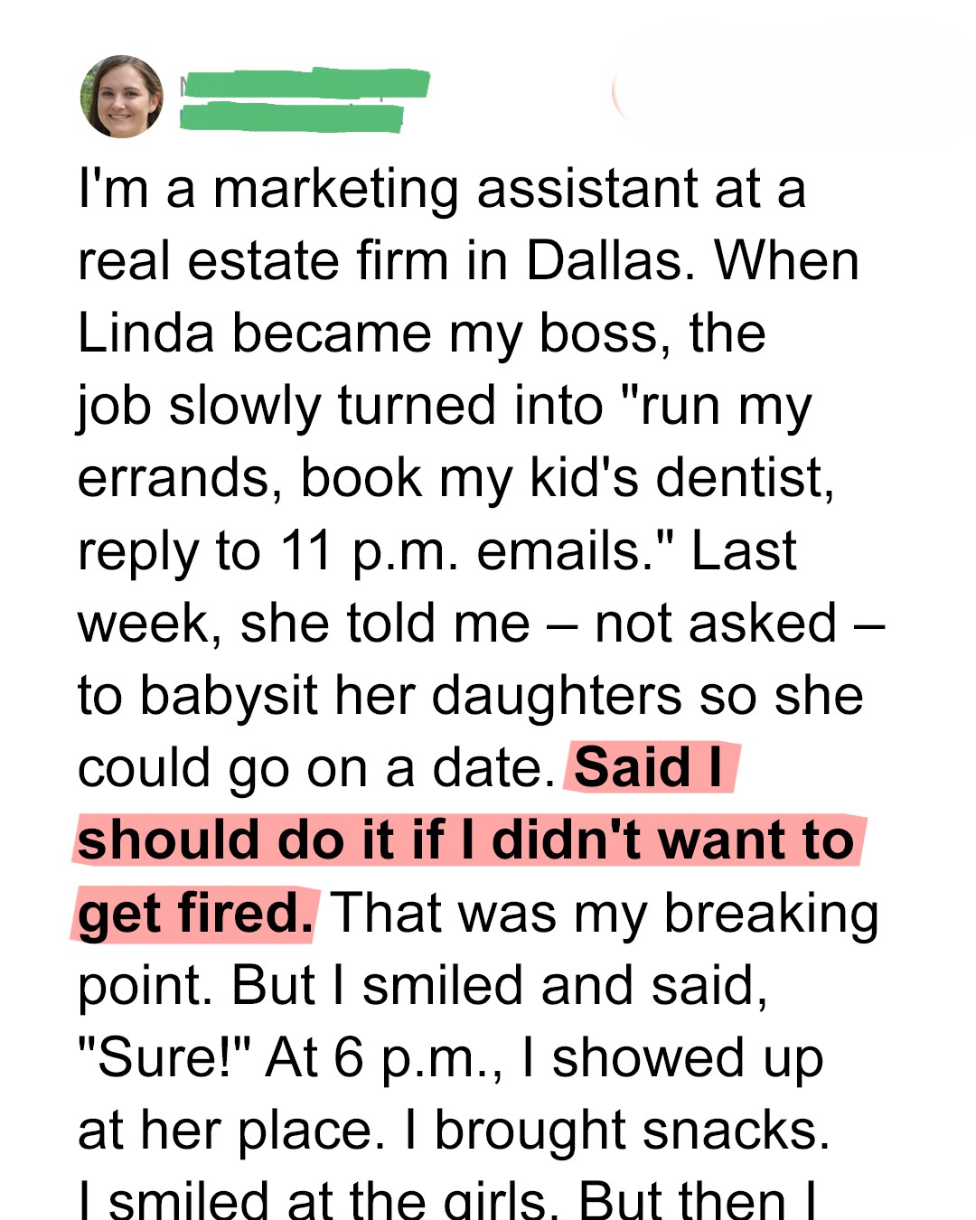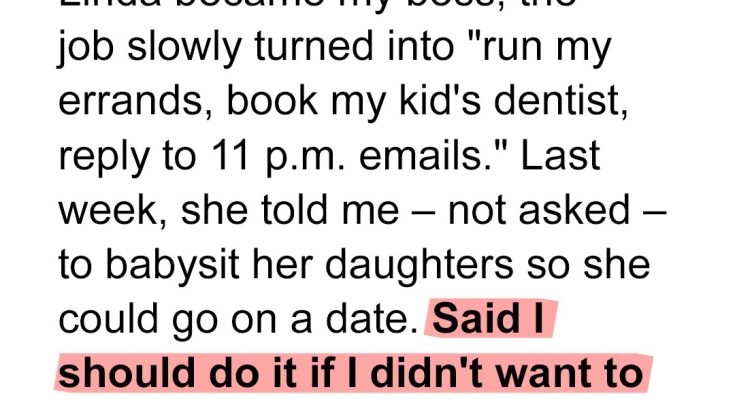 “Actually, I’m glad you brought this up,” Linda continued, examining her manicured nails. “I need you to babysit my girls tonight so I can go on a date. You do this for me, or don’t bother coming in Monday morning. Simple as that.”