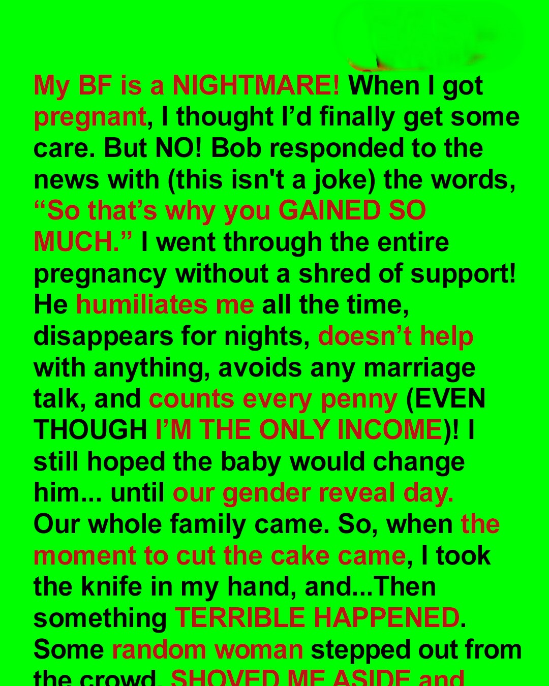 “Stop it, Alison,” Bob said coldly. “You didn’t really think I was going to raise this baby with you, did you? Look at yourself. You have let yourself go. You have gained weight. You are not attractive anymore. And after giving birth, you will look even worse. Not like Stacey. Stacey is beautiful. And she won’t actually give birth. We are just taking the baby.”