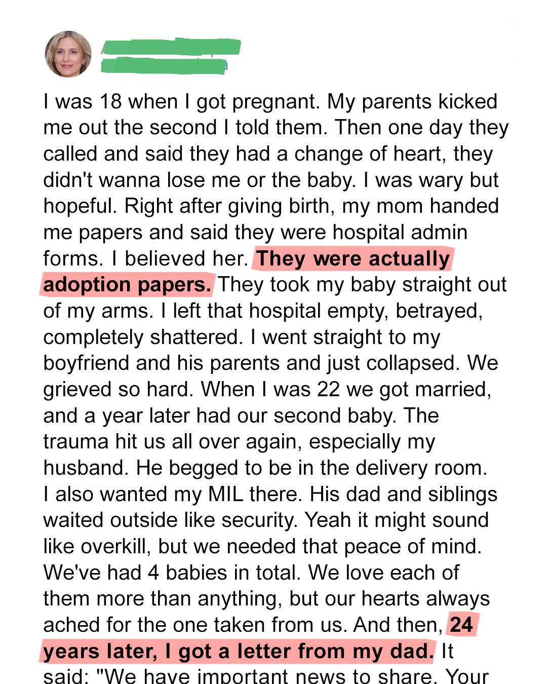 When Audrey receives a letter from the parents who betrayed her decades ago, she’s forced to return to the place where everything was taken from her. But what waits behind that door isn’t just regret… it’s a reckoning. Some reunions break you. Others show you what healing really looks like.I was 18 when I got pregnant. My parents, Maggie and Caleb, kicked me out of our home the second I told them.They didn’t ask if I was okay. They didn’t want to know how far along I was. They didn’t care that I was young and terrified. They just told me to pack my things and leave.