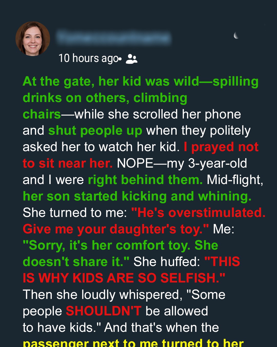 When Erin boards a five-hour flight with her anxious toddler, she’s prepared for anything… except the entitled passenger seated in front of them. What starts as quiet resilience turns into an unforgettable moment of solidarity, kindness, and the power of holding your ground when it matters most.You could tell what kind of mom she was at the gate.Everyone was bleary and half-human, clutching overpriced coffee and trying not to lose it. Our flight was early that morning. The terminal was full. Most of us were scrolling quietly or murmuring to toddlers in hushed tones, doing our best to keep it together.