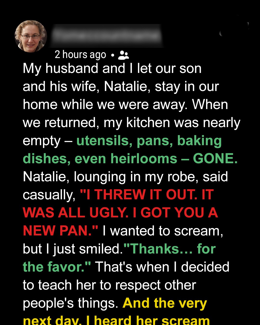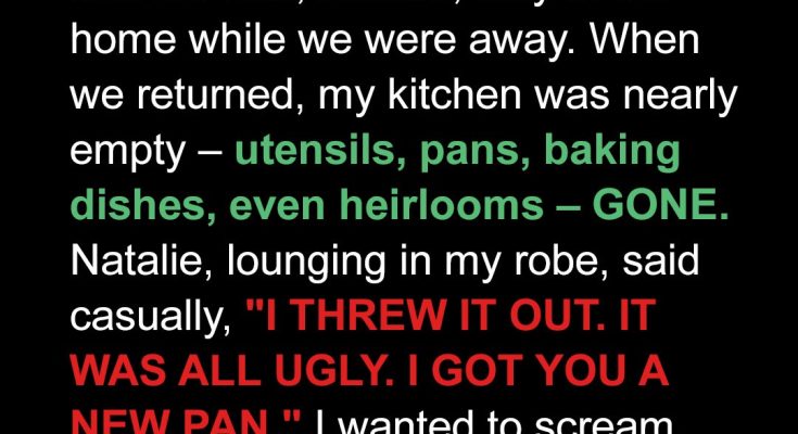 That’s how it felt the second I stepped into my kitchen after two weeks away. My husband and I had taken a much-needed break at our quiet country house—just the two of us, no phones, no fuss. Before we left, we offered our son and his wife, Natalie, a sweet little deal.“Make yourselves at home,” I’d told them. “Take care of the place while we’re gone.”Oh, how I regret those words.