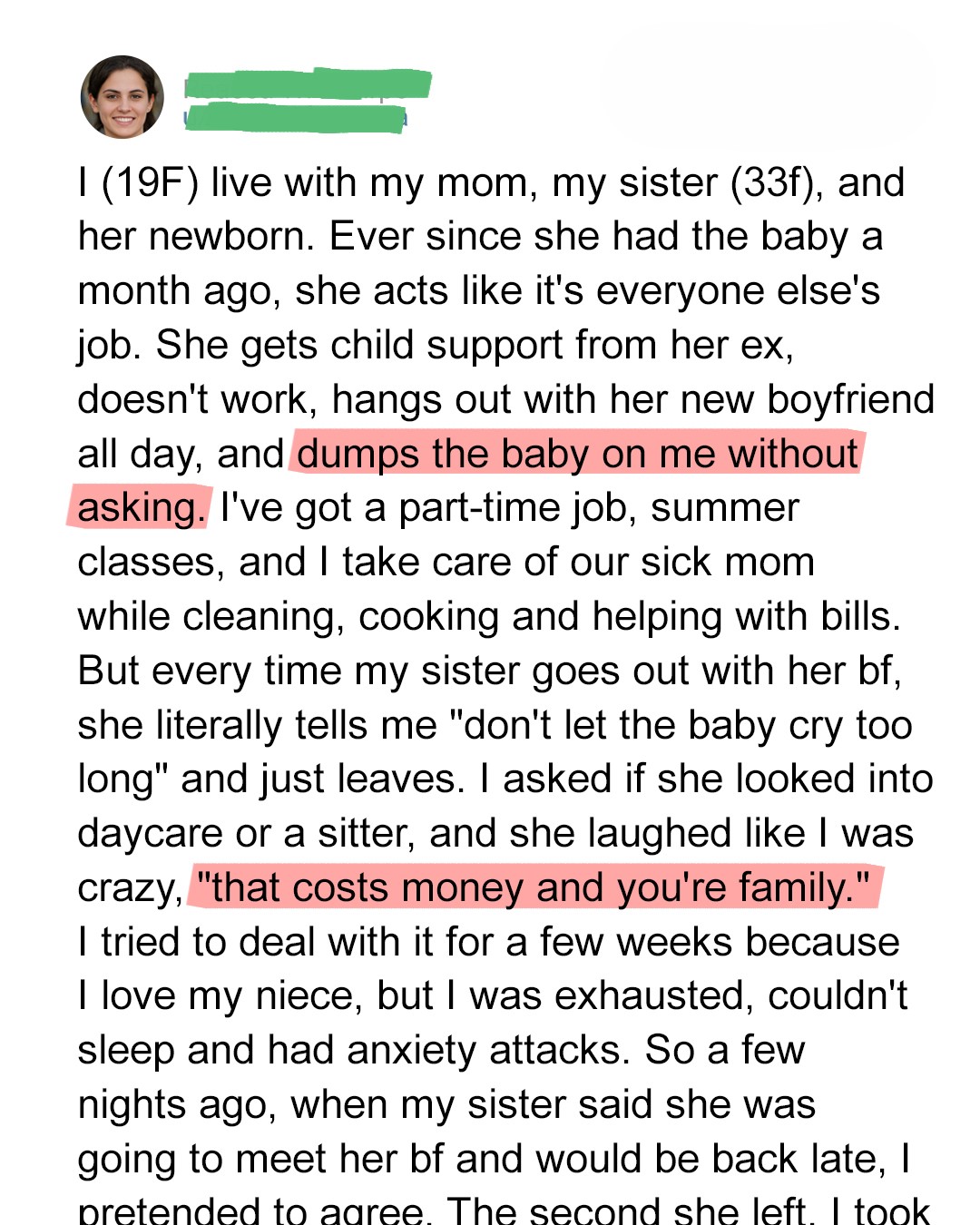 “Abby,” I said, voice shaking. “I can’t do this anymore. I barely sleep. I’m falling so far behind on my coursework. I failed a big assignment because I was too tired to even understand the topic. And nursing school isn’t just a dream for me, Abby. It’s my way out.”