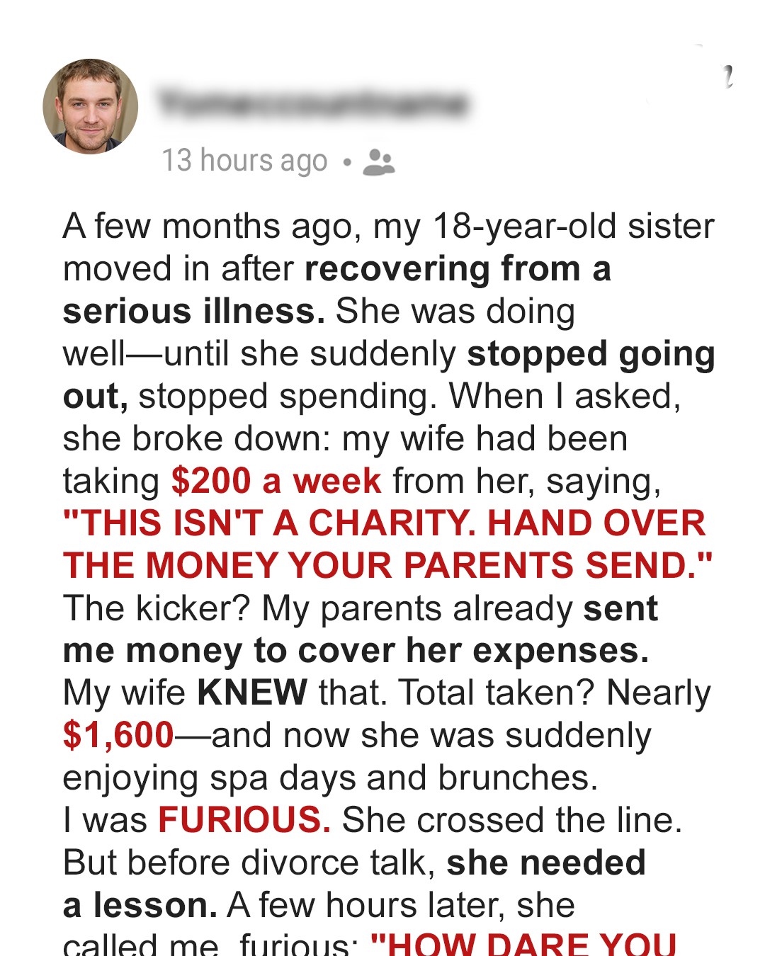 I thought I knew my wife, the woman with whom I intended to spend the rest of my life. But when my younger sister moved in with us, my wife showed me a side I couldn’t bear. She forced me to teach her a lesson she’d never forget.A few months back, I brought my little sister, Ava, into our home. She was only eighteen, still frail from battling a severe condition that had knocked her out of high school for nearly a year. I thought having her close would be good for her health, until I noticed something strange about her behavior.