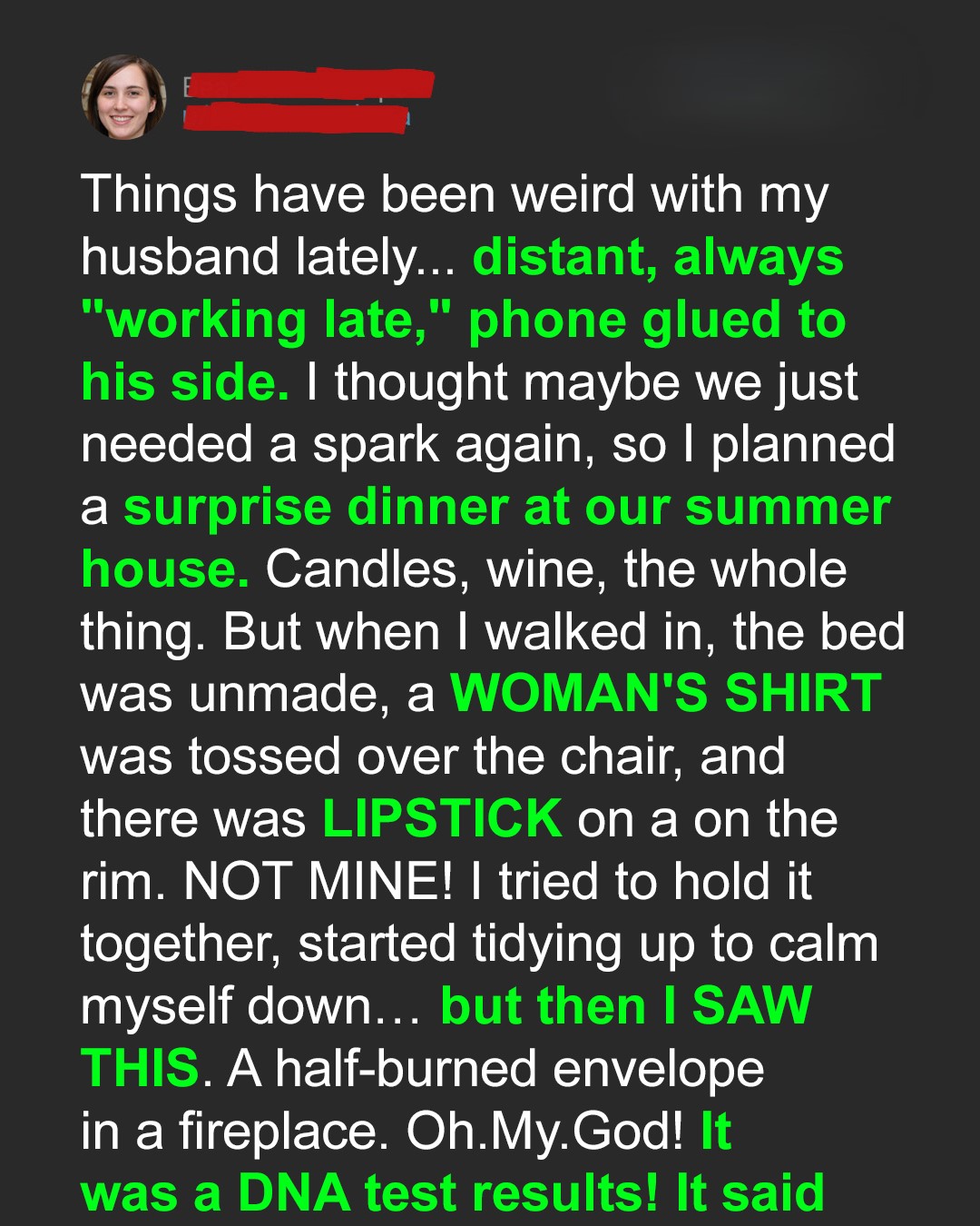 I thought I was planning a surprise for my husband at our summer house. Instead, I found lipstick on a mug, a woman’s shirt on our chair, and a half-burned DNA test with his name on it.Have you ever wondered if the person sleeping beside you is keeping a secret big enough to break you?My husband, Daniel, had been acting differently for weeks. He became distant. Tense. Answers got shorter. His phone started staying face down. When I asked what was wrong, he waved off.“Just work stuff.”