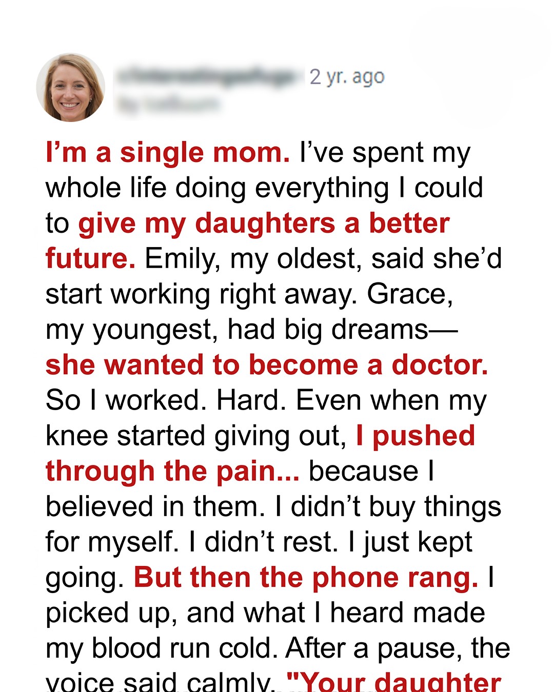 For illustration purposes only. | Source: MidjourneyI worked day and night, gave up my dreams, and ignored my health just to pay for my daughter’s college. I believed every sacrifice was worth it—until a single phone call shattered everything I thought I knew. What I discovered left me speechless.Ever since I had children, everything I did was for them. I dedicated my life to making theirs better, and I thought I was doing a good job. But it turned out I was wrong.