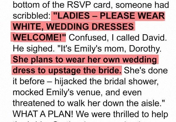 “It’s Emily’s mom,” he said, sounding weary. “Dorothy. She’s… planning to wear her old wedding dress to outshine Emily.”“Come again?”“You heard me. She’s pulled stunts like this before. She crashed Emily’s bridal shower wearing a white cocktail dress, openly mocked the wedding venue to guests, and even threatened to walk Emily down the aisle if her ex-husband didn’t ‘pull himself together’ for the day.”My mouth fell open. “That’s outrageous.”