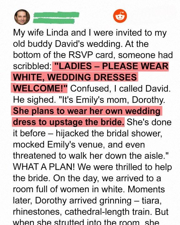 “Okay, you have to see this.”She passed me the RSVP card.At the bottom, written in handwriting far too decorative to belong to David, was the most absurd request I’d ever seen on an invitation: “LADIES — PLEASE WEAR WHITE, WEDDING DRESSES WELCOME!”I stared at it, half expecting the words to rearrange into something sensible. “Is this a printing error… or some kind of dare?”