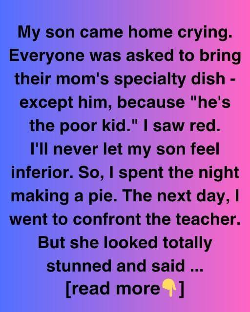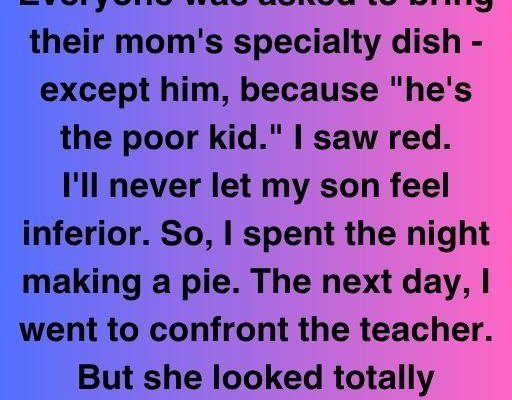 Our son came home crying. All but him were requested to bring their mom’s specialty dish because “he’s the poor kid.” I saw red. I’ll never degrade my son. So I made pie all night. The next day, I confronted the teacher. She looked shocked and continued, “I never said anything like that. I never excluded anyone, including your son.”I paused. I held the warm apple pie I made from scratch, something I hadn’t done in years. She frowned, bewildered and worried. I could tell she wasn’t acting.“I’m sorry,” she said, advancing.