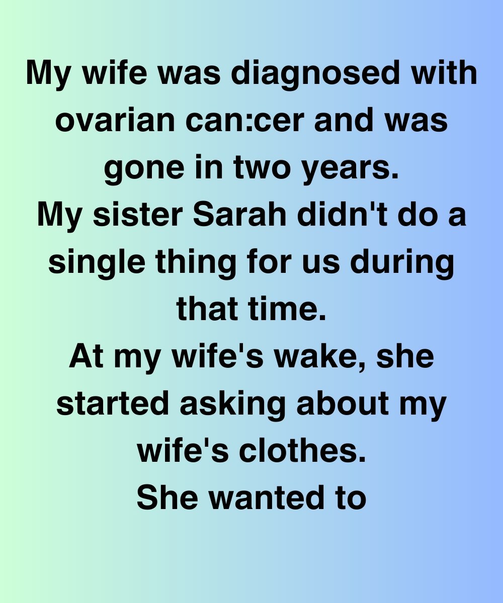 My wife was diagnosed with ovarian cancer and was gone in two years.My sister Sarah didn’t do a single thing for us during that time.At my wife’s wake, she started asking about my wife’s clothes.She wanted to know if she could “have a few of her scarves, or maybe some of her jewelry.”I remember just standing there, numb, holding a cup of half-cold coffee that someone had pressed into my hand hours earlier. I hadn’t even made it through the line of people offering condolences when she said it.“They’re just going to sit there,” she added with a shrug, like she was doing me a favor.