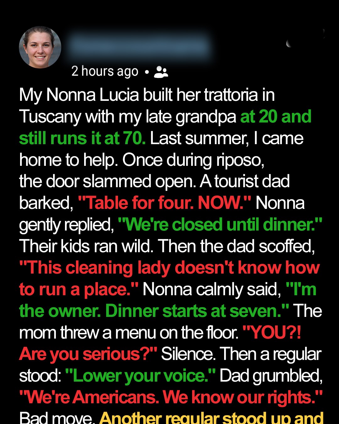A smiling older woman | Source: PexelsWhen entitled tourists insult Aurora’s grandmother during a quiet afternoon at the family restaurant, the room holds its breath. What follows is a lesson in grace, loyalty, and the kind of justice that doesn’t need shouting to be heard. Some tables are sacred… and some guests forget where they’re sitting.There are some places the soul never leaves, even when life tries to pull you away.For me, that place has always been the little trattoria tucked between the sun-warmed stone streets, where rosemary and garlic cling to the air.It is called Trattoria di Luce and it carries my grandmother’s name, Lucia. She opened the restaurant at 20 with my late grandfather, building it from scratch with their bare hands.