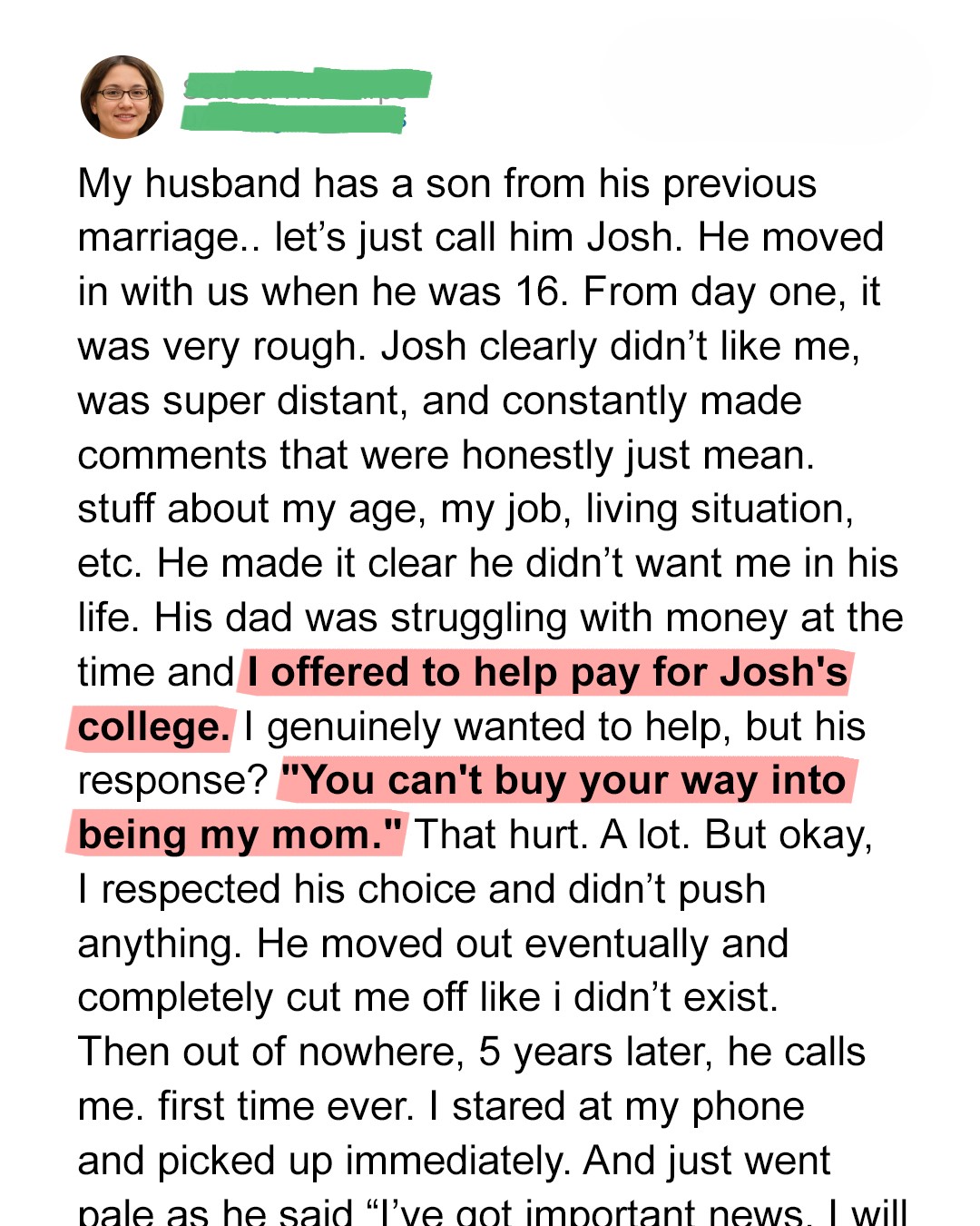 My Stepson Rejected My College Fund Offer, Saying ‘You Can’t Buy Your Way Into Being My Mom’ — 5 Years Later, He Called to Announce Important News