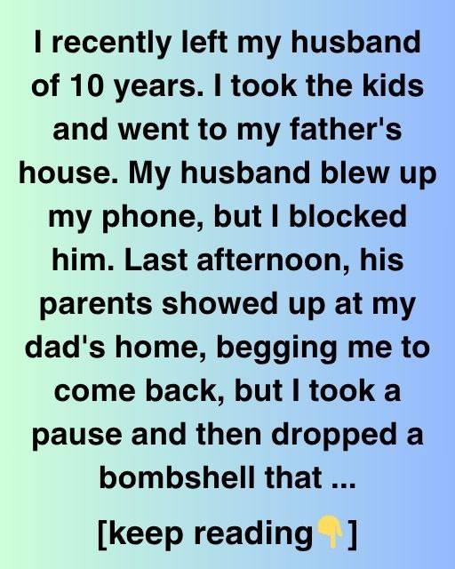 My 10-year marriage ended lately. Our kids and I went to my father’s house. My husband blew up my phone, but I blocked him. His parents arrived at my dad’s house last afternoon, pleading for me to return, but I paused and dropped a bombshell that froze them. I glanced at his mother and said, “He cheated on me. For three years.”