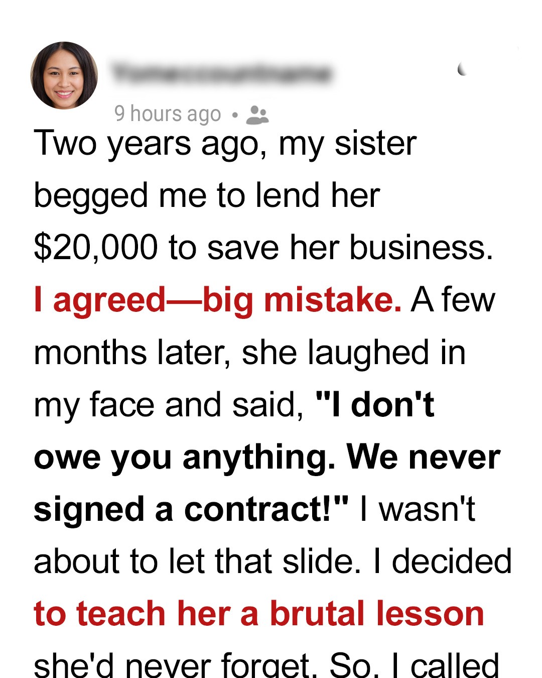 I wanted to believe she was trying. I wanted to believe that the sister I had trusted with $20,000 still respected what that trust meant.